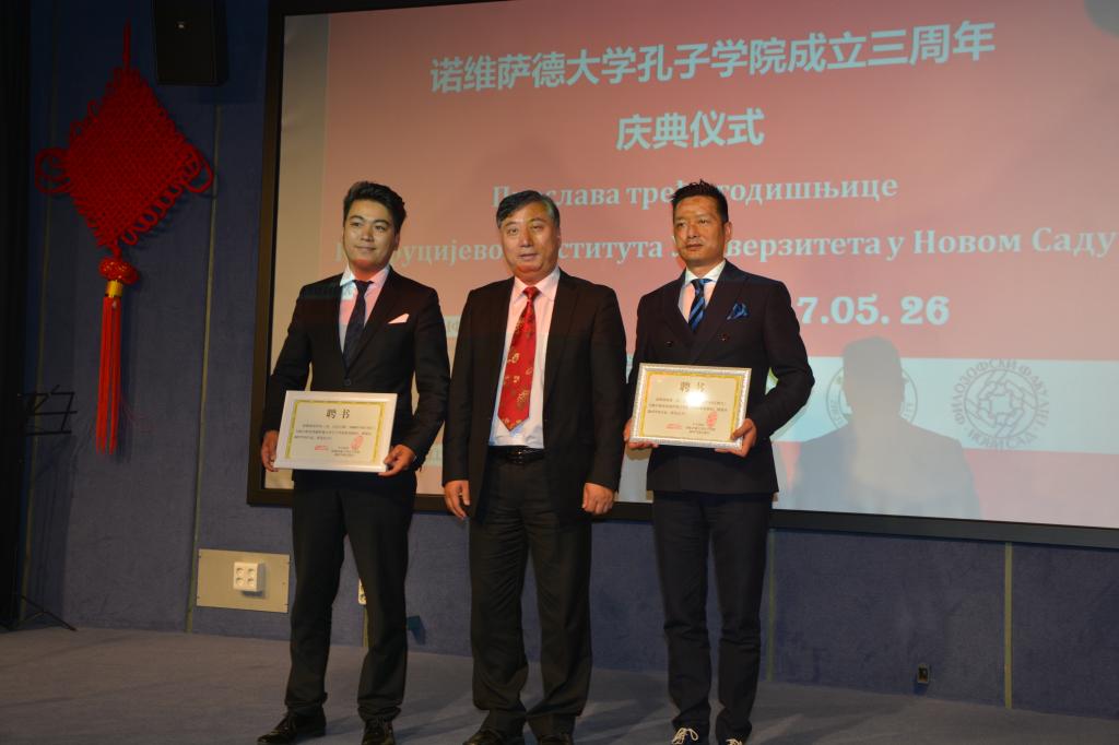 庆典现场,对诺大孔院的塞方优秀员工、中方优秀教师和志愿者、首届“一带一路·我和汉语的故事”征文比赛及中国书画比赛的奖得者进行了表彰,同时聘请塞尔维亚华人商业联合会会长郭晓和伏伊伏丁那华人商业联合会会长邹军伟为诺大孔院特别顾问。