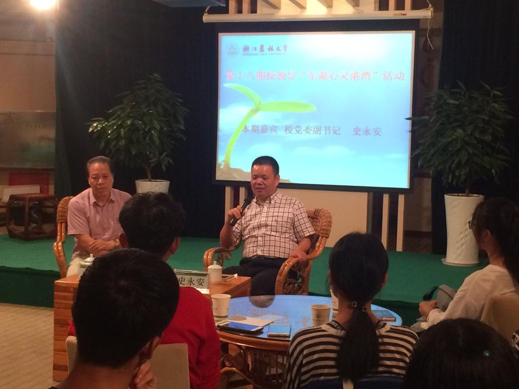 9月20日,本学期第一次校领导“东湖心灵港湾”活动如期举行。这次的主讲嘉宾为校党委副书记史永安,来自全校各学院的同学代表参加了此次互动。活动由心理中心顾问、外国语学院党总支书记张敏生主持。