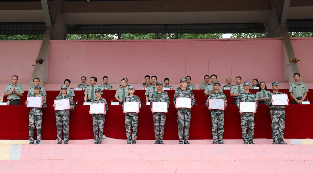 大会对2017级学生军训工作进行了表彰,相关领导为先进集体颁奖。农学动科营1排、林生营12排、环资营17排、工程营21排、园林营27排、理学信息营33排、文化法政营46排、经管营49排、外语法政营56排等荣获军训先进集体荣誉。