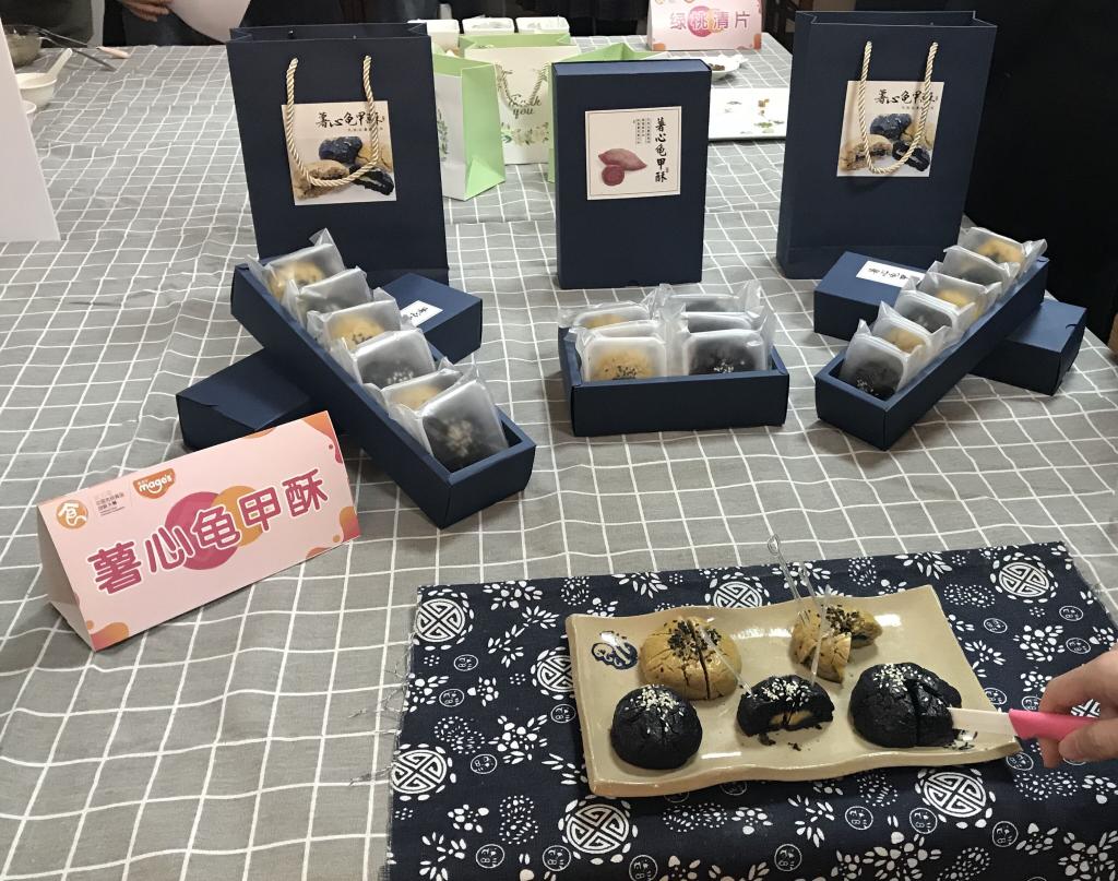 “小饼如嚼月,中有酥如怡”,邱桑团队从传统糕点桃酥入手,将桃酥、紫薯、红薯相结合,创新研发出了一款纯薯类糕点“薯心龟甲酥”。该款产品从原料、技术、配料三方面做出创新,改善了薯粉难成团的缺陷,提供了一种全新的无面粉天然薯粉糕点的制作方法。决赛经过产品现场展示环节、分组答辩环节,评委会根据作品的技术创新、文化创意和经营开发等三个部分的指标评选,最终,《薯心龟甲酥》脱颖而出荣获特等奖。