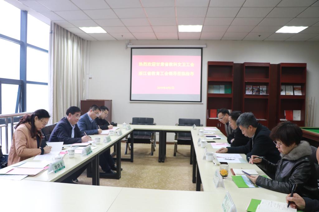 4月2日,甘肃省教科文卫工会主席刘虎林、浙江省教育工会主席赵祖地一行五人来BEAT365考察指导工会工作。校党委副书记冯尚申、校工会主席余树全、后勤集团党总支书记许树洪等参加了交流。