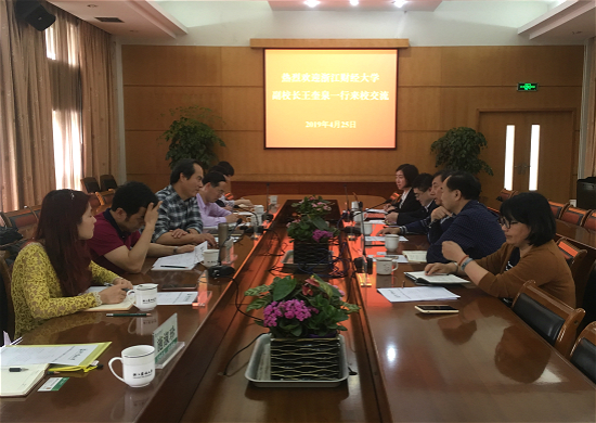 4月25日,浙江财经大学副校长王奎泉一行7人来校调研交流学科建设和研究生教育工作并座谈。副校长金佩华主持座谈会。