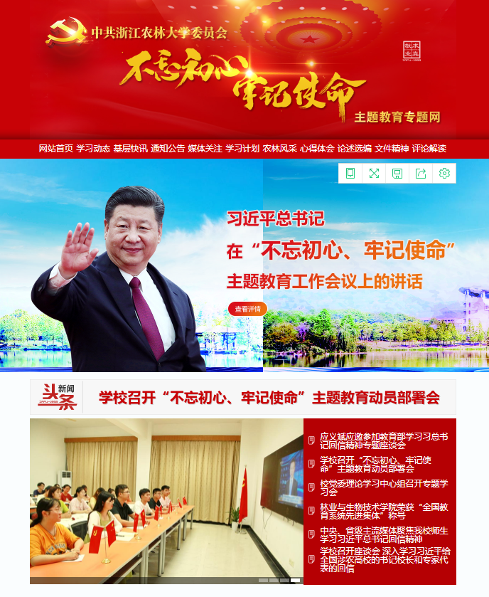 广大师生可以通过点击学校官网 “‘不忘初心 牢记使命’主题教育专题网”链接访问专题网站。也可输入网址http://ztjy.zafu.edu.cn/登陆网站。