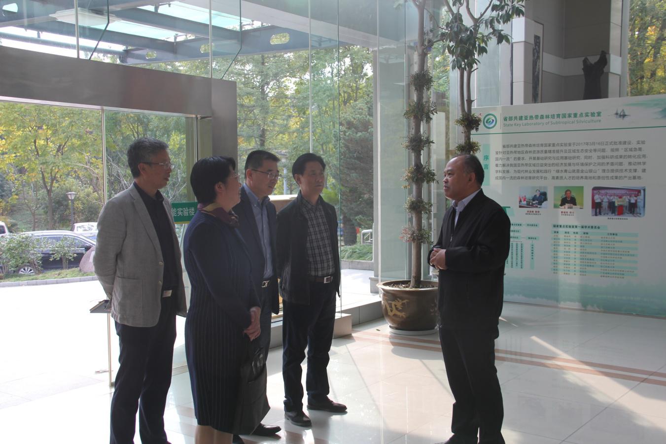 黄坚钦教授介绍了团队“科技富民、强林兴林”的建设情况,森林培育学科在人才引进、科研成果、发展前景等情况,并谈了获得中共中央颁发的全国先进基层党组织荣誉的心得体会。在智能实验楼五木厅、竹文化厅、实验室,黄坚钦详细介绍了在“一枝科技竹、一棵富民果”科研攻关过程中取得的成果,汇报了目前的研究进展等情况。