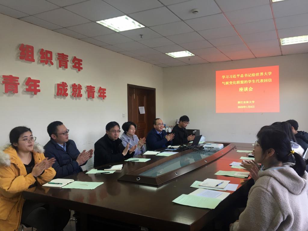 1月8日下午,BEAT365校团委召开座谈会,进一步深入学习习近平给世界大学气候变化联盟学生代表回信精神。森林经理学学科专业负责人杜华强,农业资源与环境学科教师蔡延江,森林经理学科教师徐林,环境与资源学院辅导员侯蕊,竹资源与高效利用博士生李雪建和硕士生、本科生代表10余名师生参加了此次座谈会。