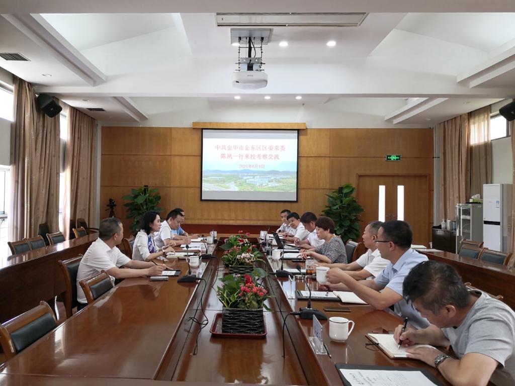 6月9日,金华市金东区委常委、区政府党组成员陈夙一行来校考察交流。校党委副书记施美红、副校长吴家胜出席并参加座谈。