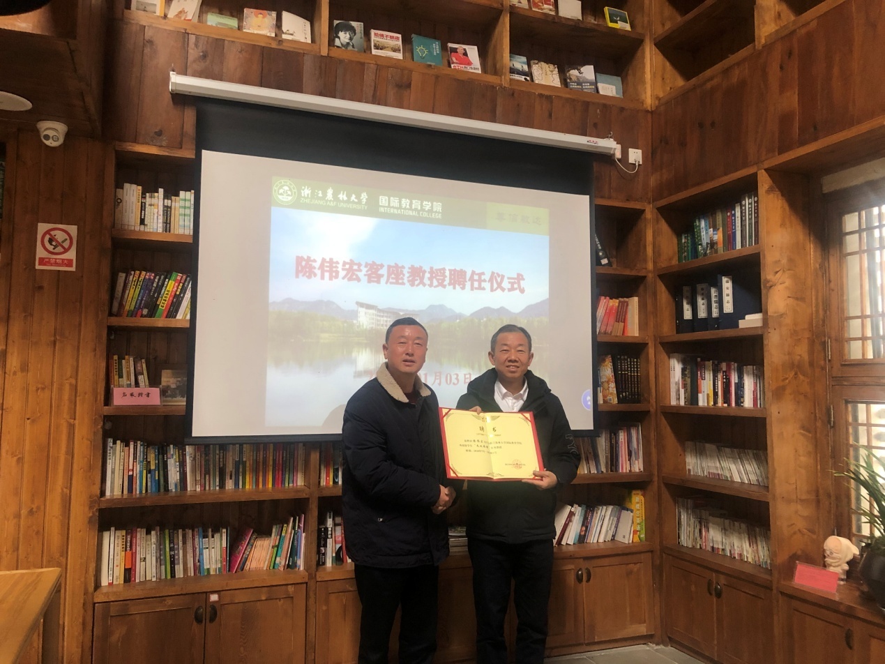 会上,国际教育学院举办了授聘仪式,聘任陈伟宏副局长为BEAT365外国留学生“文化旅游”客座教授。吴家胜为陈伟宏颁发了聘书。他表示,陈伟宏近几年来为临安区村落景区运营作出了较大贡献,所推进的村落景区运营“临安模式”受到了省委省政府领导的批示肯定。这次聘请陈伟宏先生为学校外国留学生“文化旅游”客座教授,将为进一步加强区校合作创造更多的机会。陈伟宏感谢BEAT365英国官网国际教育学院的信任,并表示一定会进一步深入与学校的对接,共同为区校战略合作添砖加瓦。
