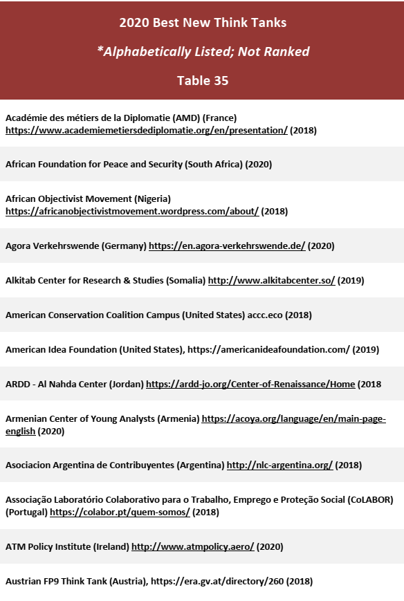 报告根据全球智库综合排名、分布区域、研究领域和特殊成就四大类别,共列出50多个分项榜单。其中,在“2020最佳新智库”榜单中,全球共有133家智库入选,其中来自中国的智库共20家,来自浙江省的智库仅为2家。