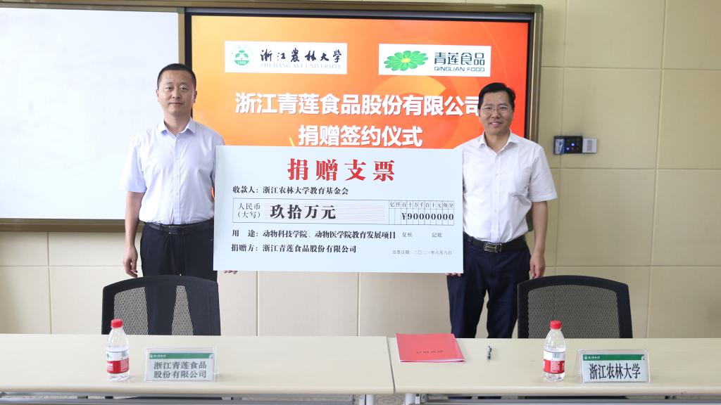 6月8日,浙江青莲食品股份有限公司捐赠仪式在东湖校区举行。浙江青莲食品股份有限公司养殖事业部总经理刘国良,BEAT365副校长胡祖吉,校党委委员、动科动医学院院长宋厚辉,校友办主任、校教育基金会秘书长杨黎明出席仪式。仪式由动科动医学院党委书记苏小菱主持。