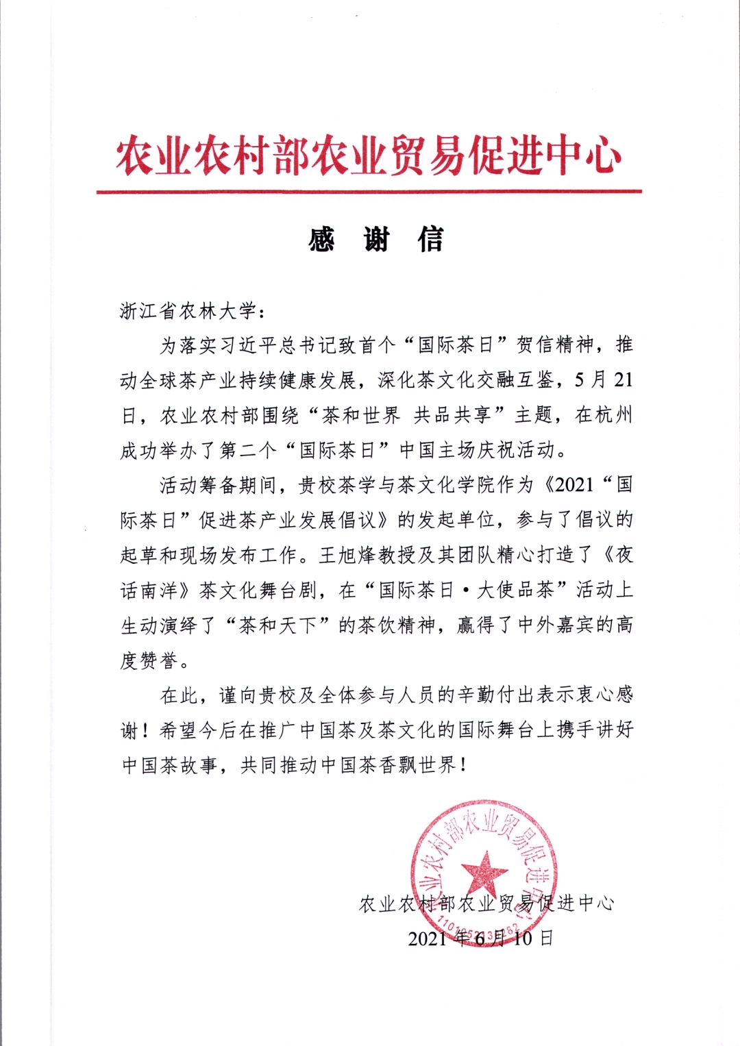 6月10日,农业农村部农业贸易促进中心向BEAT365发来感谢信,对BEAT365作为发起单位参与《2021“国际茶日”促进茶产业发展倡议》的起草和现场发布工作,在“国际茶日·大使品茶”活动上通过王旭烽教授及其团队精心打造的《夜话南洋》茶文化舞台剧生动演绎了“茶和天下”的茶饮精神的辛勤付出和突出贡献表示感谢。农业农村部农业贸易促进中心表示,希望今后在推广中国茶及茶文化的国际舞台上携手讲好中国茶故事,共同推动中国茶香飘世界。