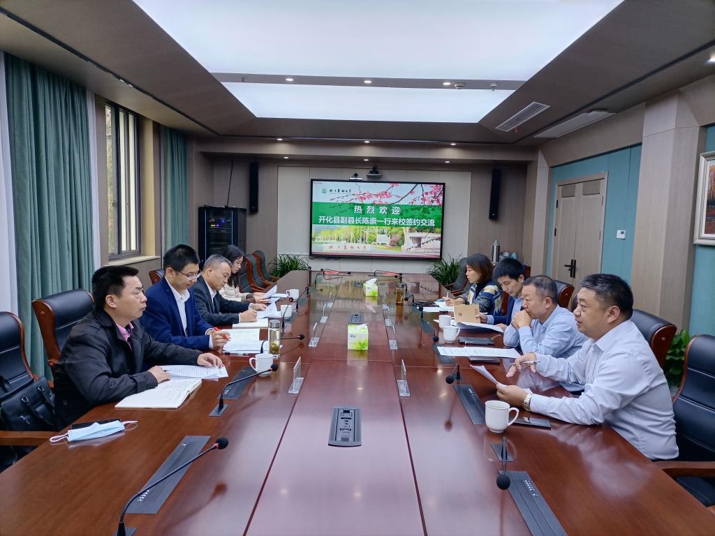 吴家胜对陈崇一行的来访表示欢迎。他指出,学校与开化县长期保持着紧密的合作关系,尤其是在生态农业发展和美丽乡村建设等方面有着良好的合作基础,学校将继续立足开化生态环境和产业发展实际,充分利用开化县丰富的山林资源,共同就高山蔬菜、中药材、优质水果种植等农业领域开展紧密合作。开化自然禀赋良好,学校人才技术优势明显,拥有省内最齐全的乡村振兴学科专业、完善的乡村振兴服务平台和专业的乡村振兴服务团队,他希望双方聚焦浙江高质量发展建设共同富裕示范区这一主题,探索“全校服务全域”乡村振兴模式,不断寻找共同发展的结合点,为创建全省共同富裕示范区打造开化样本。