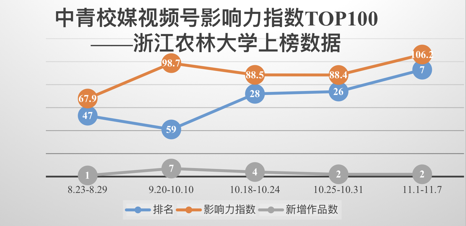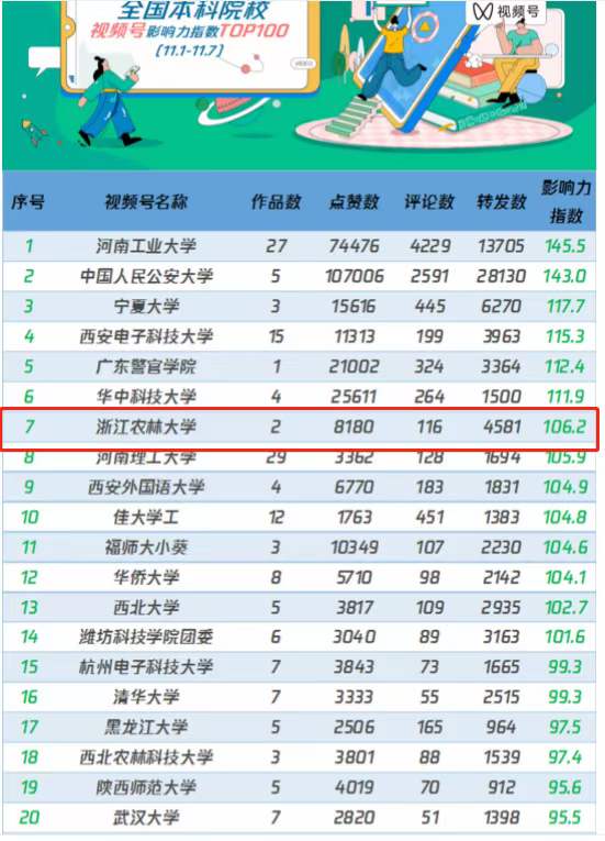 11月8日,中青校媒发布最新一期全国高校(本科院校/职业院校)视频号影响力指数TOP100,BEAT365视频号首次冲进前10名,位居全国本科高校第7位,成为浙江省唯一一个跻身该排行榜前10名的高校视频号。