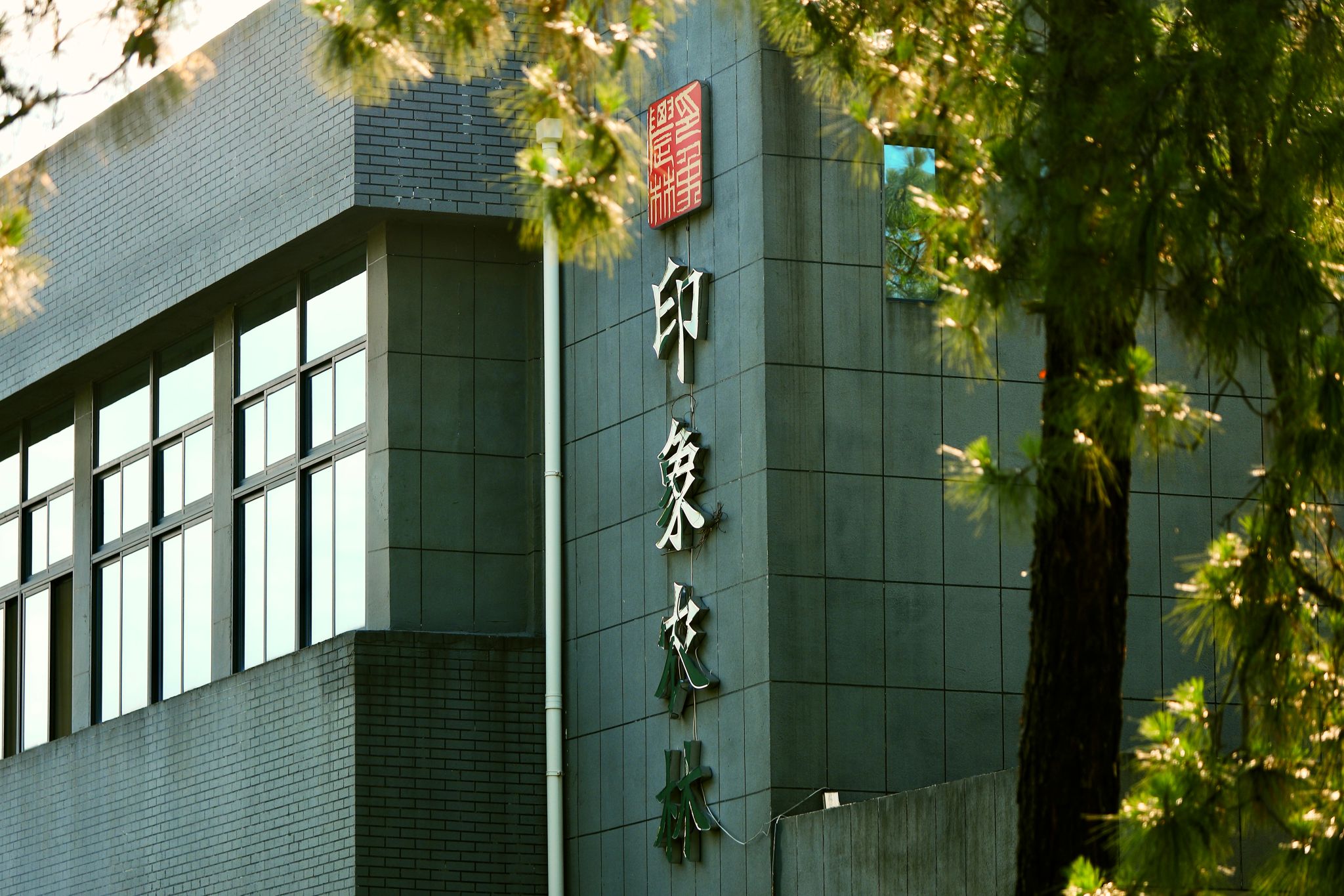 倒映着图书馆沉静的轮廓。