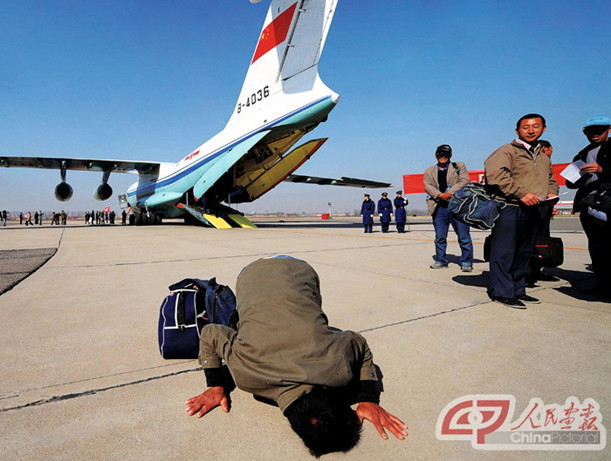 2011年3月4日,北京南苑机场,41岁的中国水电二局工人冯克荣一下飞机,就激动地跪吻祖国土地。2011年2月28日下午,经中央军委批准,空军4架伊尔76型运输机从乌鲁木齐机场飞赴利比亚,执行撤离中国在利比亚人员任务。这是中国空军首次派运输机赴海外执行撤离中国人员回国任务。3月4日,4架飞机先后降落在北京南苑机场,机上搭乘的287名在利比亚的同胞回到了祖国怀抱。随着利比亚局势持续恶化,各国都将撤离本国人员提上议事日程。但唯独中国自始至终由政府主导,以举国之力倾情救援,从国家领导人关注,国务院成立应急指挥部统筹协调,到派出前方工作组,驻外使馆联动,军民协作,都是国际上的创新之举。