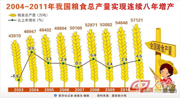 党的十六大以来的十年,是中国农业农村发生历史性巨变、农民得实惠最多的时期之一。中共中央一号文件连续9年关注三农,彻底取消了农业税,坚定不移走中国特色农业现代化道路,加快推进社会主义新农村建设。农业综合生产能力不断提高,粮食产量实现历史性的“八连增”,粮食储备超过5000亿斤,是历史最高水平。农业农村发展的好形势,为国家战胜各种风险挑战奠定了坚实基础,为促进国民经济平稳较快发展提供了有力支撑。