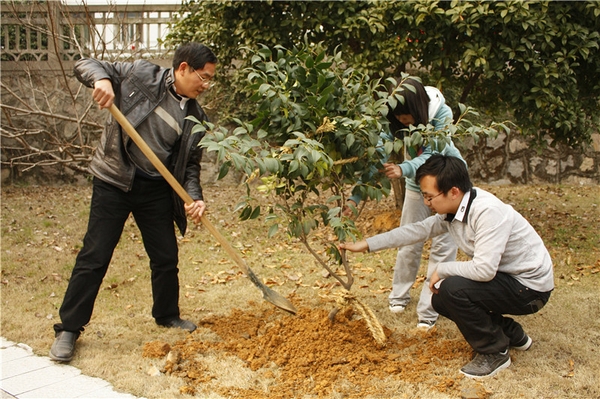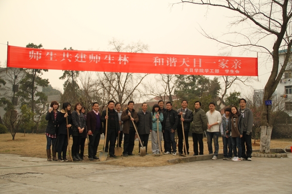 3月11日下午,天目学院院在桃李苑组织开展了以“师生共建师生林 和谐天目一家亲”为主题的植绿活动。学院领导师生一起拿起铁锹松土、种树、浇水,干劲十足,热火朝天。经过一个下午的努力在桃李苑种上了山茶、桂花、红梅等十余株树苗,为美丽的衣锦校园又增添了几分绿意和生机。