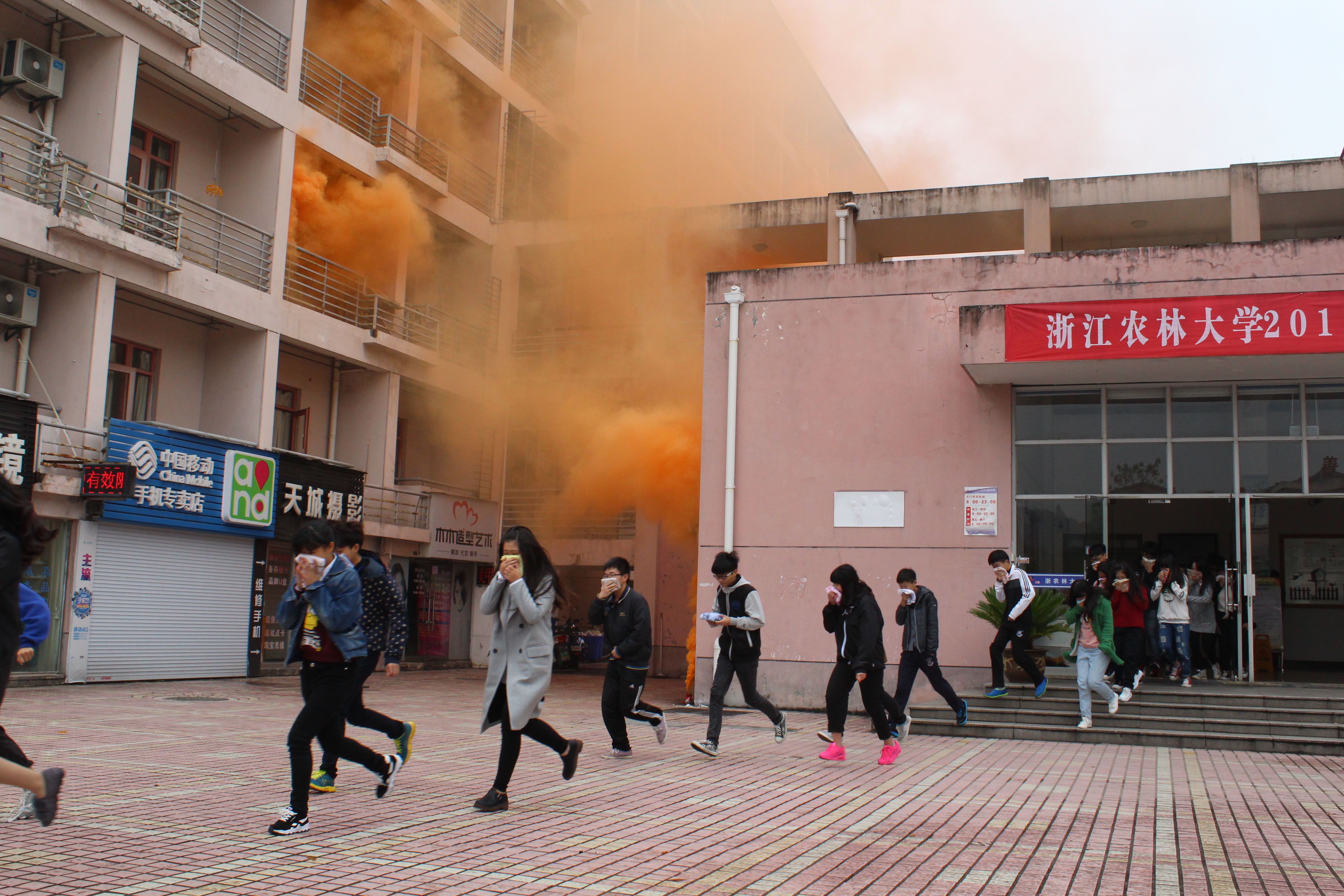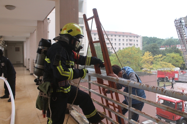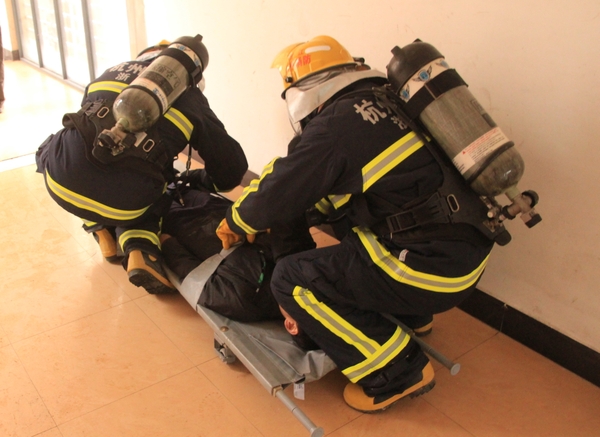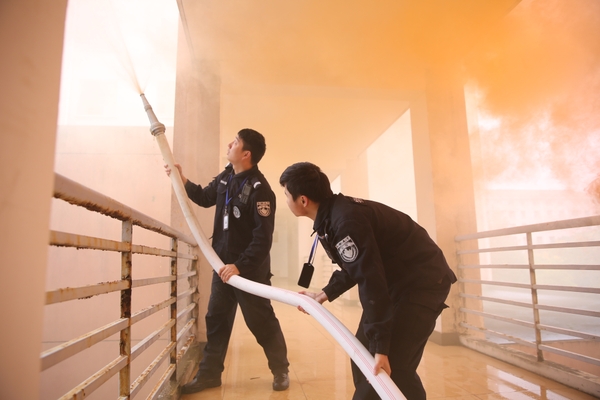 现场模拟学生宿舍发生火灾,公寓值班员立即拨打“校园110”报警电话,指挥中心立即启动BEAT365英国官网应急预案,迅速调集校志愿消防队员赶赴“火灾现场”开展灭火、疏散。被困学生在楼宇疏散引导员的指导下用湿毛巾捂住口、鼻,弯着腰,沿墙角、楼梯有序撤离。