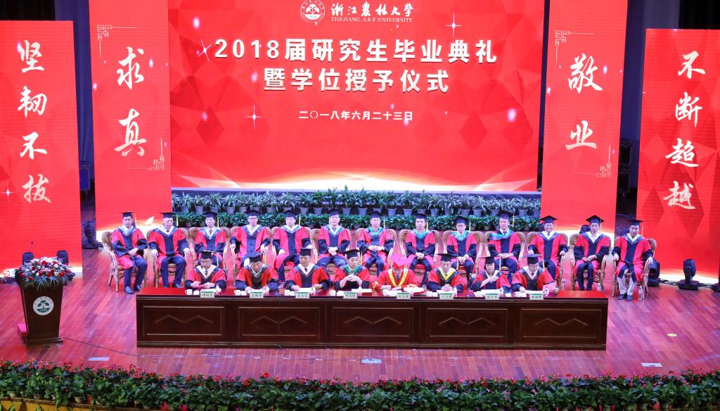 6月23日,学校隆重举行2018届研究生毕业典礼暨学位授予仪式。校党委书记周国模,校长应义斌,副校长王自勇、金佩华、沈月琴,校党委委员、宣传部部长胡祖吉,校党委委员、组织部部长童晓晖等出席典礼,典礼由校党委副书记史永安主持。