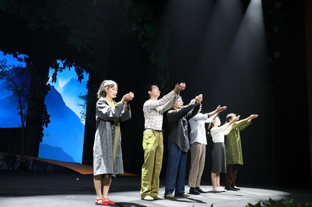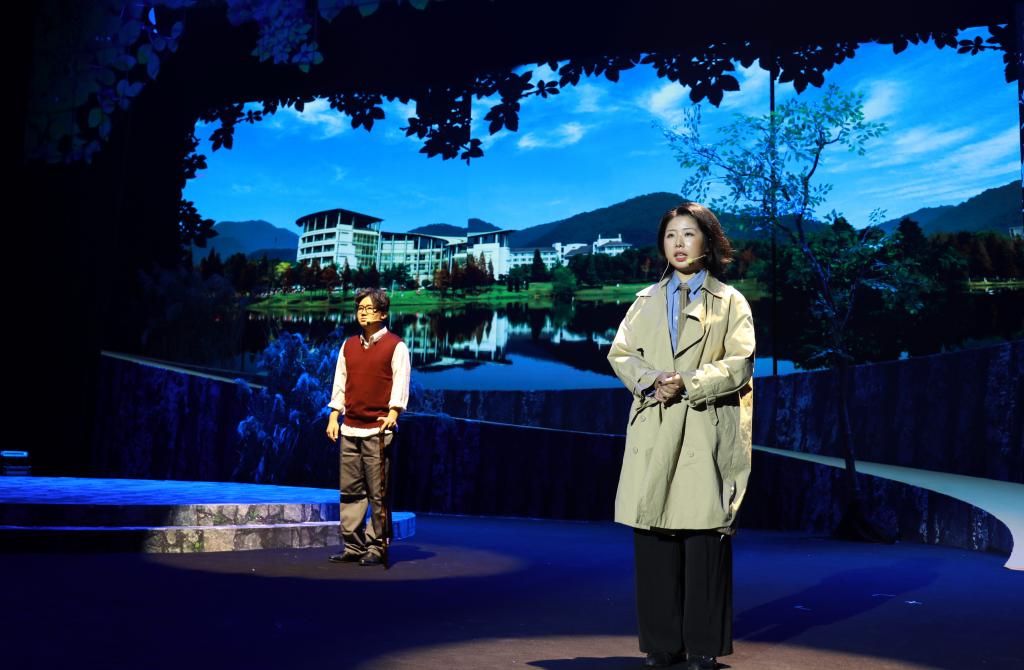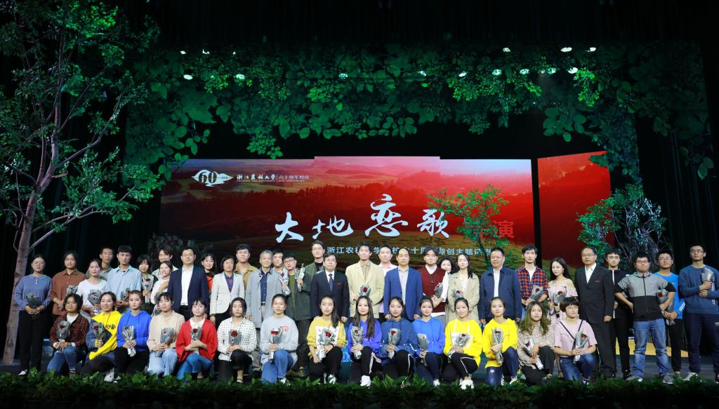 《大地恋歌》以“党的好干部”杨东海校友,“浙江省优秀共产党员”“浙江省模范科技特派员”邵志鹏老师等为人物原型,以学校上世纪80年代以来,师生科技助力“两山”理念发源地——安吉浑泥岗脱贫致富为故事原型,讲述校友“孙大林”毕业后扎根农村基层,一心服务“三农”,教师“秦志鹏”牺牲在科技扶贫路上的感人故事;讴歌了一代代具有“肯干、实干、能干”品质的浙农林人,几十年薪火相传,“把荒山变青山、把青山变金山”的农林故事。整场话剧情节跌宕起伏,高潮迭起,当看到“秦志鹏”博士冒着大雨送香榧苗因公殉职后,他怀孕的妻子声嘶力竭地呼唤他的名字时,现场许多观众热泪盈眶。大幕落下,全体观众集体起立,向演员们的精彩演出报以经久不息的掌声。