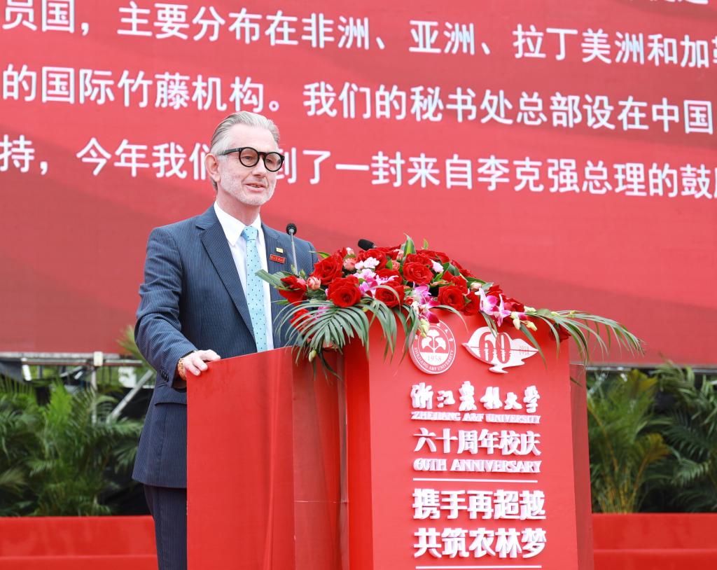 伊利诺伊大学香槟分校副校长及教务长Andreas Cangellaris、国际竹藤组织总干事Hans Friederich分别发言,祝贺学校60华诞,希望继续深化合作,成为亲密伙伴。
