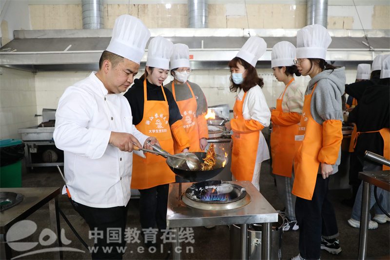 随后,学生们学着切菜烧菜,“董大厨”则一边指导一边讲解烹饪每道菜需要掌握的切菜要领、烧菜技巧、营养成分……下课时间还没到,同学们的“作业”已经陆续完成。虽然菜品质量参差不齐,但是大家对自己的“作业”都比较满意,纷纷表示要打包带回寝室与同学共享。