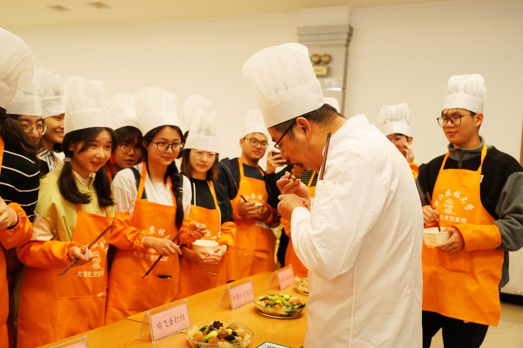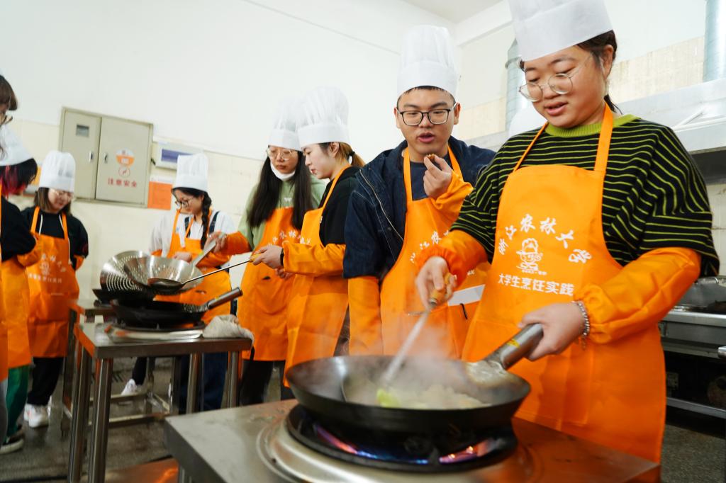 随后,学生们学着切菜烧菜,“董大厨”则一边指导一边讲解烹饪每道菜需要掌握的切菜要领、烧菜技巧、营养成分……董铭华说,“能够教会学生掌握一些烹饪的技艺,我觉得和做厨师一样有意义、有成就感。”
