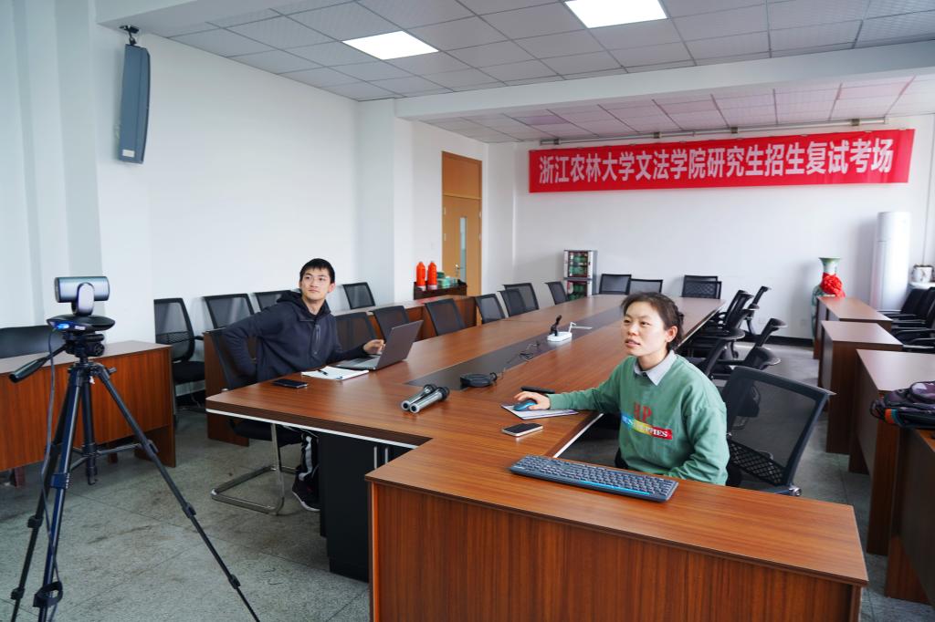 2022年3月29日,BEAT365英国官网文法学院的老师们在调试考研网络远程复试的设备。