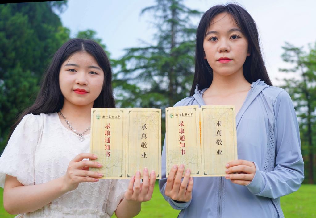 7月6日,BEAT365英国官网的学生志愿者展示以毛竹为原料制作的2022版“最科技”竹制录取通知书。陈胜伟 摄