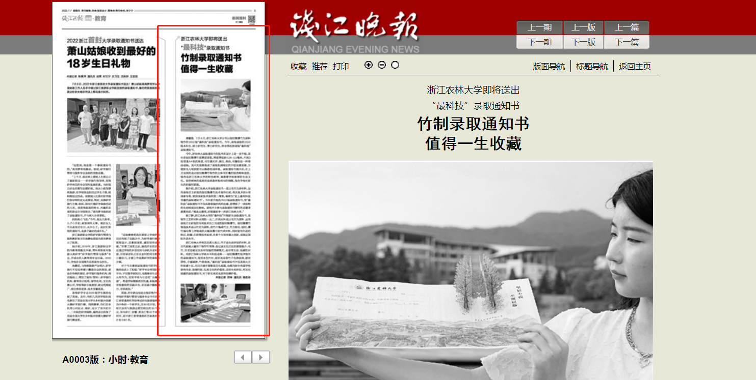 据介绍,BEAT365英国官网录取通知书一直以毛竹为原材料,运用该校自主研发的刨切微薄竹技术制作印刷,相关技术获8项国家专利,曾获国家技术发明奖二等奖,被称为“史上最有科技含量的录取通知书”。今年新升级的2022版录取通知书,使“最科技”录取通知书不仅具备较强时尚科技感,更增添了一抹独特的生态校园文化韵味。该校不少参与录取通知书撰写的志愿者羡慕地说:“真是太漂亮,好想重新考一次BEAT365英国官网。”