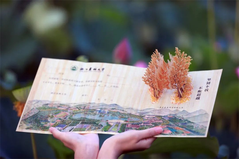 “最科技”录取通知书厚度仅0.28-0.3毫米,可像纸张一样卷曲成轴;内页底图是浙农林东湖校区的手绘实景地图,方便新生熟悉校园环境;右上方是由刨切微薄竹制作的立体可折叠的银杏树林造型。