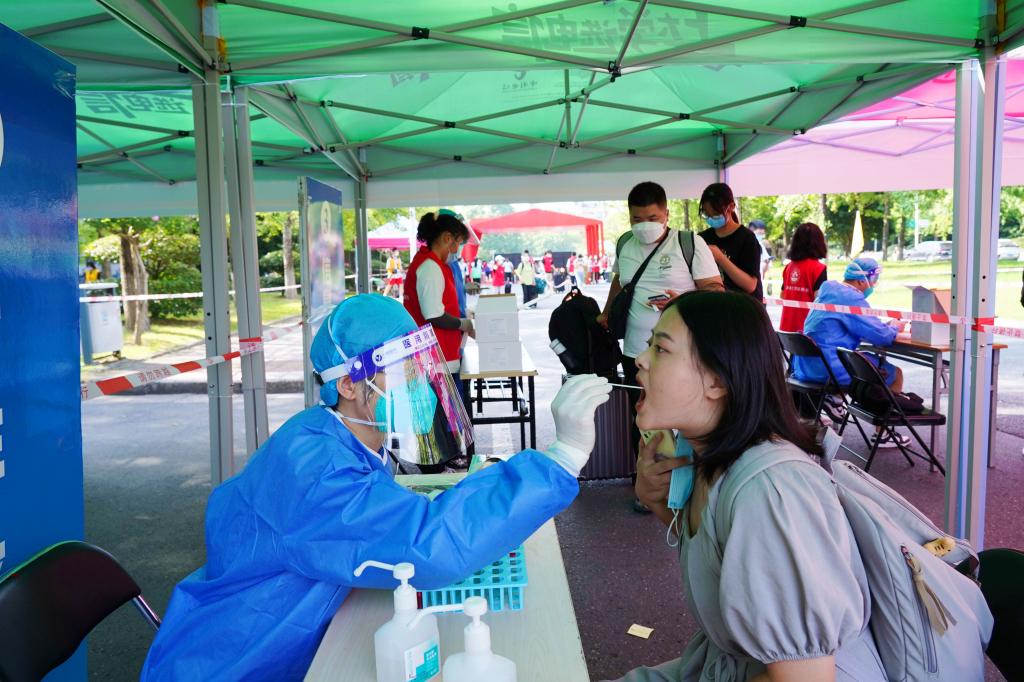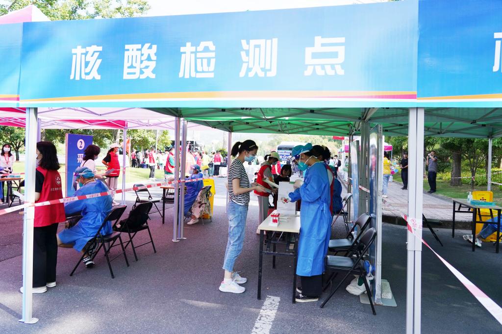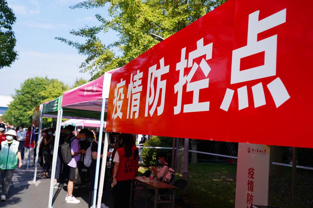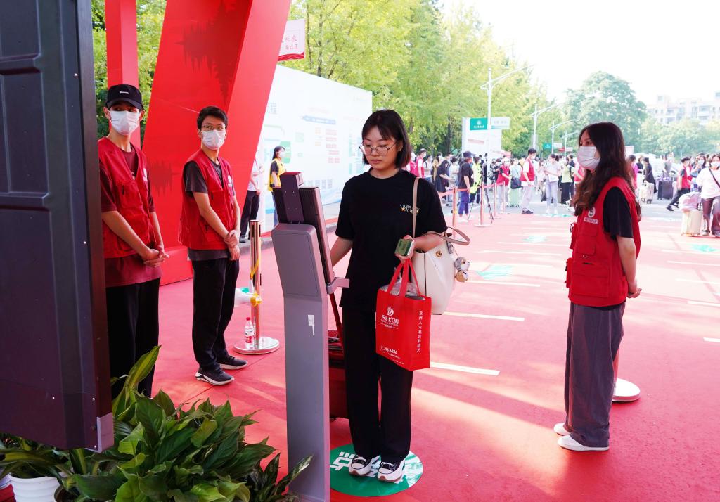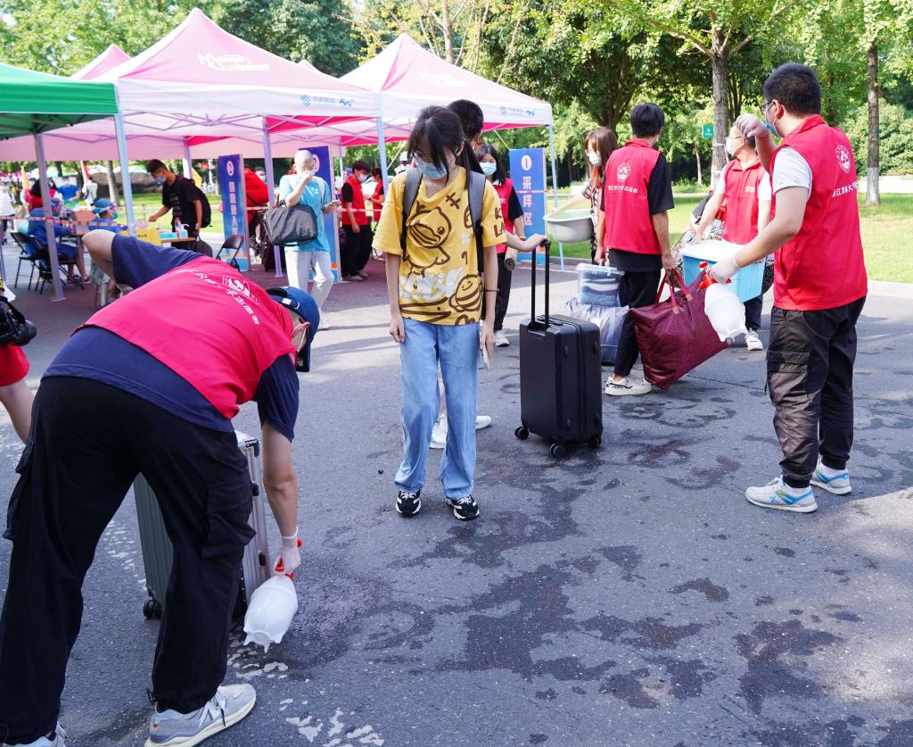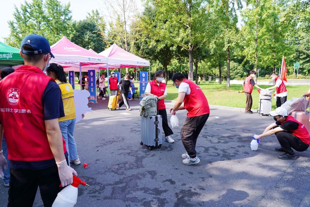 2022年9月11日,BEAT365英国官网新生在报到现场查验“两码一表”、自动测温、身份核验,完成新生报到手续后立即进行核酸检测、行李消毒。