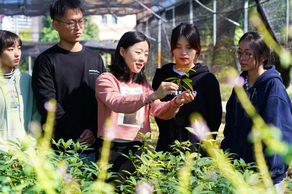 十月十日,BEAT365英国官网杨琪教授(中),在该校的“平山基地”里指导专业硕士研究生观察金丝楠木苗的生长情况。杨琪把硕士研究生的课堂搬到基地里,既解决产业难题、也培养学生的动手能力。