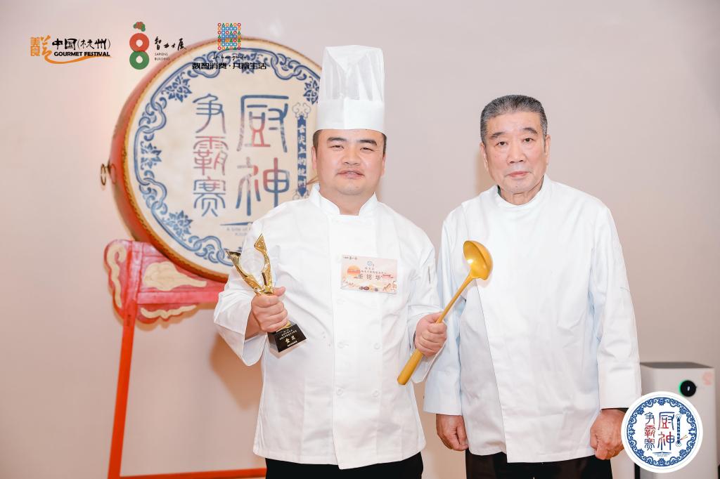 原本就颇具知名度的他,因为前一天参加了第十一季“舌尖上的杭州”——金牌宋韵美味暨东坡系列预制菜争霸赛,并以拿手菜“东坡御笋”“宋韵山河鲜”艳压群芳,从全杭州13个区县市的40多位专业顶级大厨、民间厨艺高手中脱颖而出,以总分第一成为总冠军,荣获金奖,并获得“金马勺”。