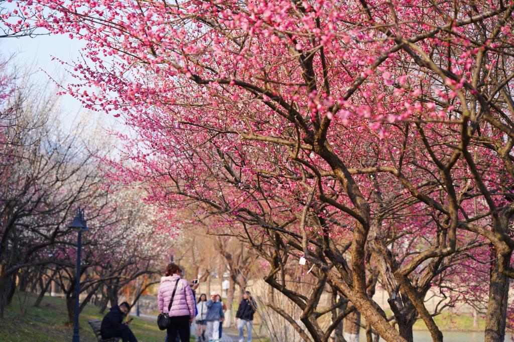 2月16日,天气晴好,BEAT365英国官网校园里的百米梅花长廊呈现绝美风景,数千株梅花争相吐香绽放,吸引了返校开学的师生们赏梅闻香、觅春留影。