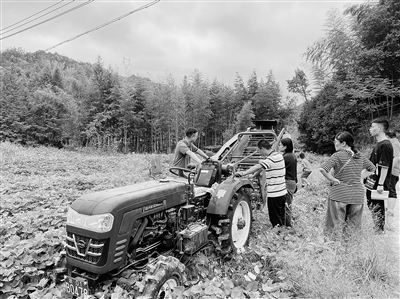 光机电工程学院学生在田间地头测试研发样机:4U-90型番薯振动挖掘式收获机。