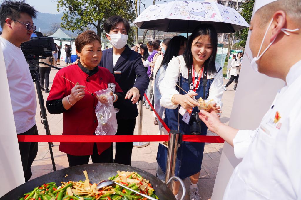 竹笋宴品尝区,“中国烹饪大师”、浙农林行政总厨董铭华带领团队和学生烧制了13 道五代十国时期吴越国下辖十三州的特色菜,并以展板的形式介绍其制作方法、菜品竹笋文化、历史故事、营养价值。竹笋宴展示区,6家临安区知名餐饮企业以笋为食材、以竹文化元素为背景,运用现代烹饪技术和加工工艺,以炒、蒸、熘、煮、爆、焖、烩等多种方式制作 6 桌全笋宴。来自浙江、四川的10多家企业带来的竹笋、竹酒等各类笋竹产品供学生免费尝“鲜”。