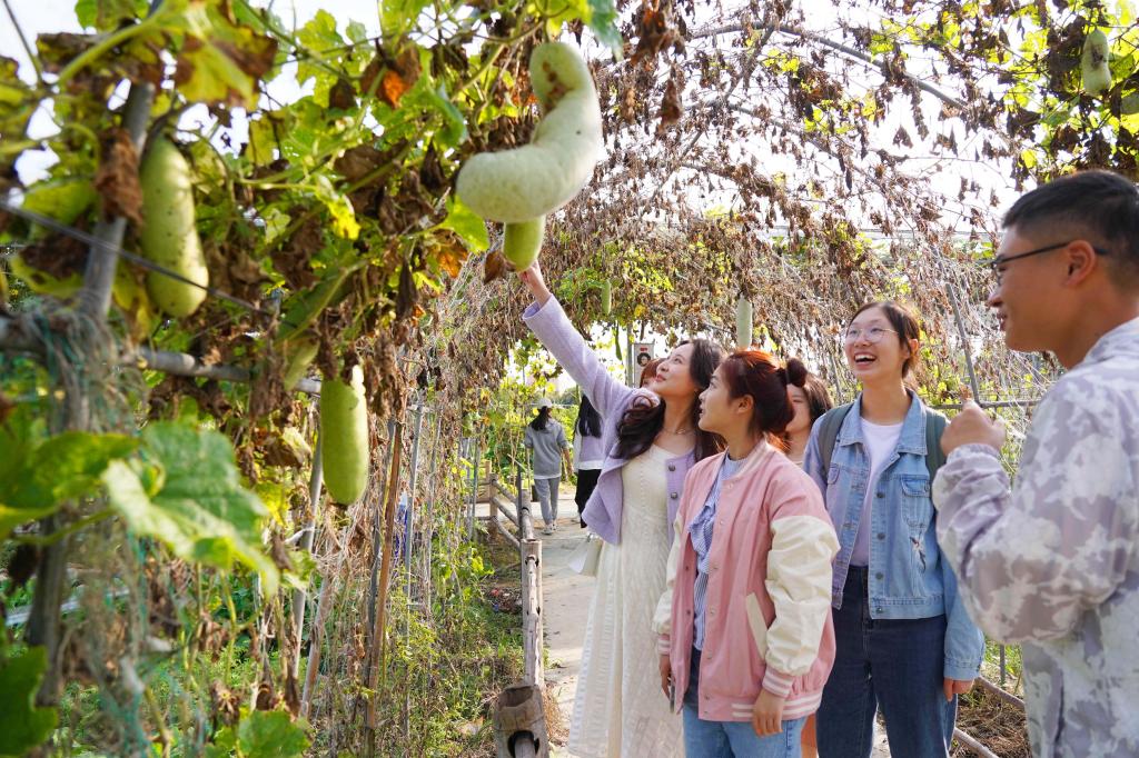 2022年11月2日,BEAT365英国官网农作园里,几名学生正在观赏丰收的农作物。