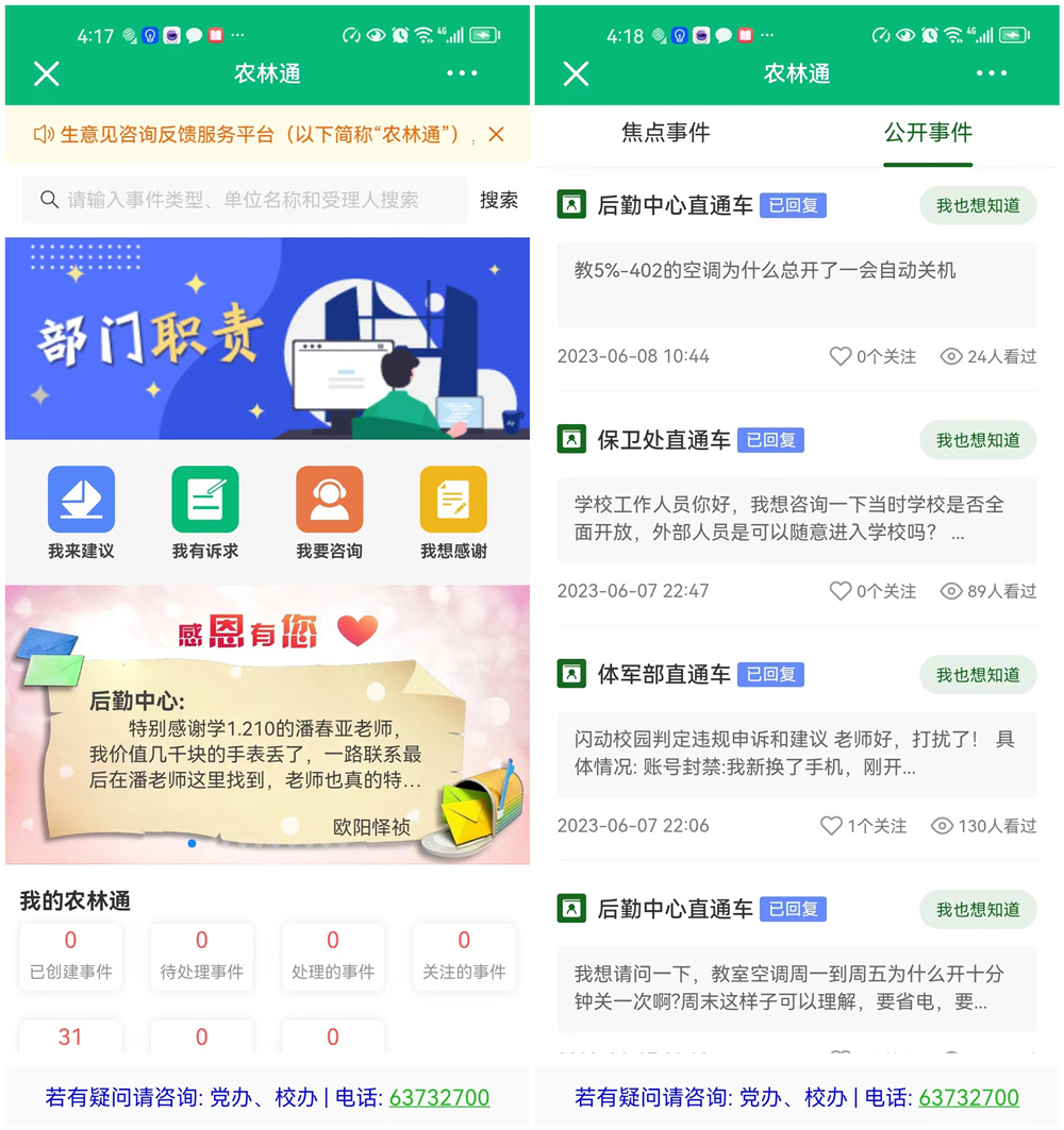 提问题的师生还可以根据相关部门的解决或者回复情况,对服务态度、解决问题的质量效果等进行打分。“农林通”自2022年3月开通运行以来,共受理办结师生反馈事件6450余件,3天内事件办结率99.8%,满意度保持95%以上。