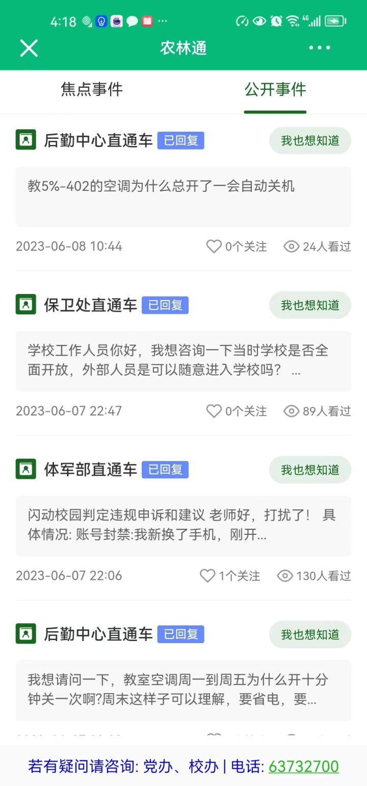 提问题的师生还可以根据相关部门的解决或者回复情况,对服务态度、解决问题的质量效果等进行打分。“农林通”自2022年3月开通运行以来,共受理办结师生反馈事件6450余件,3天内事件办结率99.8%,满意度保持95%以上。