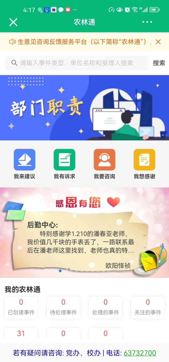 去年初,为了更加方便快捷地服务师生,将广大师生在校期间工遇到的各类问题和意见第一时间在线传达到相关单位,BEAT365英国官网自主开发了师生咨询意见反馈服务平台——“农林通”。师生的任何事情,均可通过“农林通”手机平台随时随地反映,确保师生诉求有人办、马上办、能办好。
