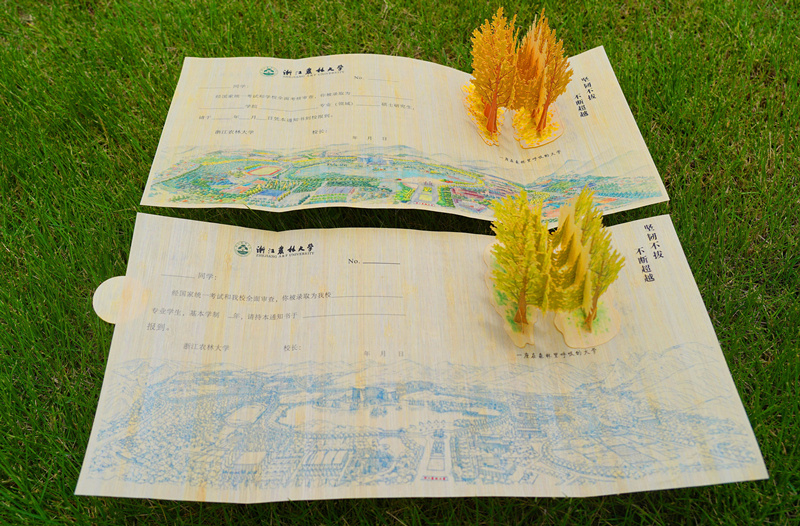 通知书内页底图是该校学生手绘的东湖校区实景地图,方便新生入校前就可以熟悉校园环境。展开后,右上方呈现的是由刨切微薄竹制作的立体可折叠的银杏树林造型,以及“坚韧不拔、不断超越”的学校精神。银杏树林造型分为两个版本,绿色银杏叶的为本科生版、黄色银杏叶的为研究生版。银杏是学校的特色树种,寓意着学校浓厚的生态文化。