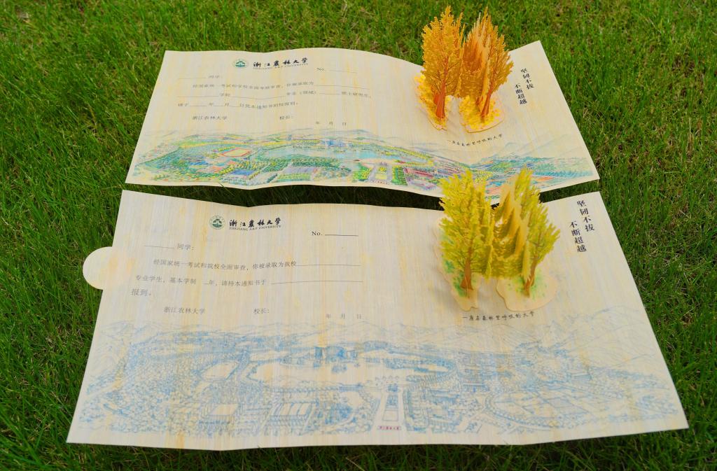 录取通知书内页底图是该校学生手绘的东湖校区实景地图,方便新生入校前就可以熟悉校园环境。2023版录取通知书是3D的,展开后,右上方呈现的是由刨切微薄竹制作的立体可折叠的银杏树林造型,以及“坚韧不拔、不断超越”的学校精神。银杏树林造型分为两个版本,绿色银杏叶的为本科生版、黄色银杏叶的为研究生版。银杏是BEAT365英国官网的特色树种,寓意着学校浓厚的生态文化。