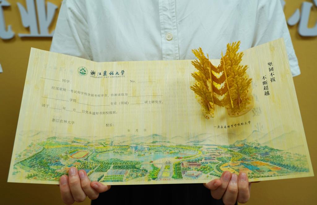 录取通知书内页底图是该校学生手绘的东湖校区实景地图,展开后,右上方呈现的是由刨切微薄竹制作的立体可折叠的银杏树林造型,以及“坚韧不拔、不断超越”的校训字样。银杏树林造型有两个版本,绿色为本科生版、黄色为研究生版。