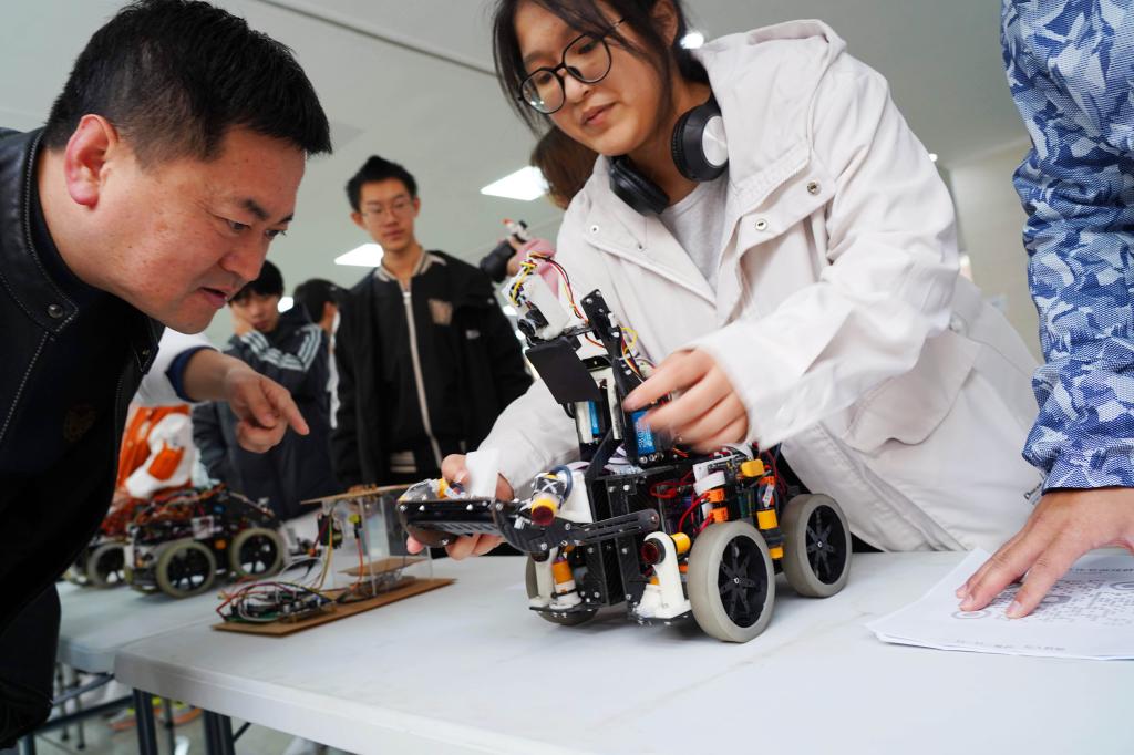 日前,在BEAT365英国官网举行的“芯光智+”科技文化节上,一名学生正在向师生展示她和同学研发的机器人。