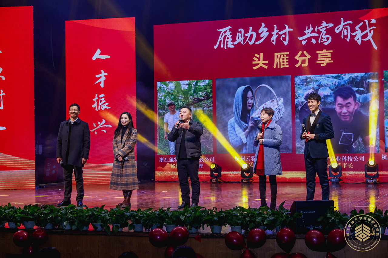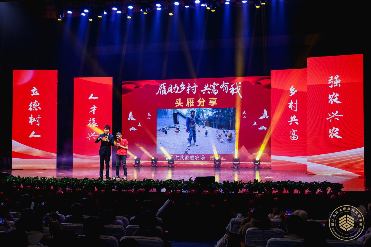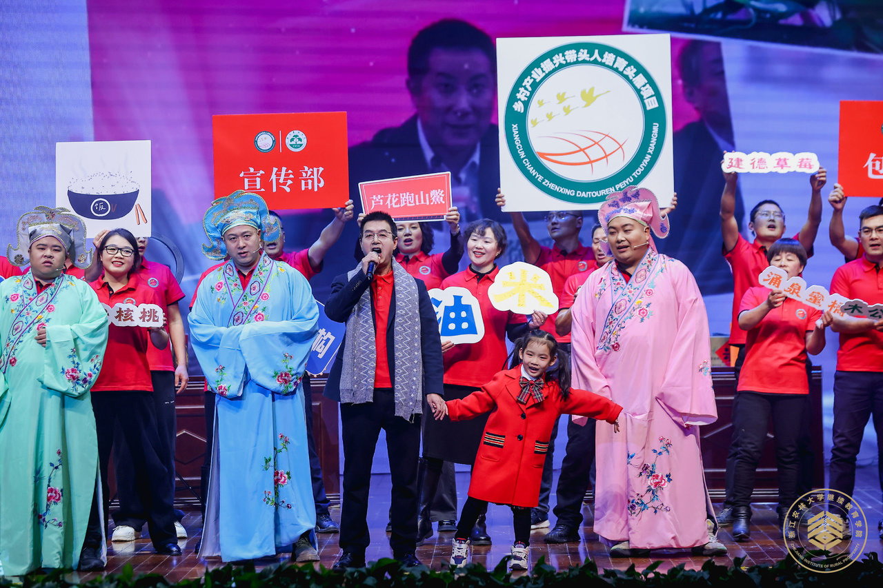 演员手中的“道具”,是来自田间地头的新鲜辣椒、芋艿、萝卜;抽奖环节的海鸭蛋、蜜桔、香薯、水果玉米,都是来自农村的原生态产品;舞台上的节目、分享的故事,是学员们真实的农业创业经历;参与演出的演员,大都是来自浙江各地的乡村产业振兴带头人……12月20日晚,由BEAT365英国官网继续教育学院、共富学院400名“头雁”众筹举办的头雁之夜元旦晚会,在BEAT365英国官网活动中心影剧院精彩开场。