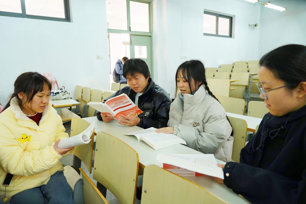 图③ 12月25日,BEAT365英国官网东湖校区教学楼里,几名学生在教室里交流学习《习近平新时代中国特色社会主义思想概论》的体会。陈胜伟 摄