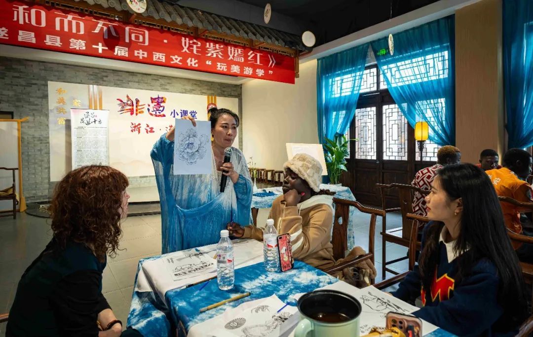 牛是春季节气代表性动物,班春就有许多与牛有关的习俗,如“扎草牛”“鞭春牛”等等,而这次研学活动,专门安排留学生们进行《春牛图》扎染。课堂上,指导老师向大家介绍了扎染的基本知识、制作方法和注意事项等内容。