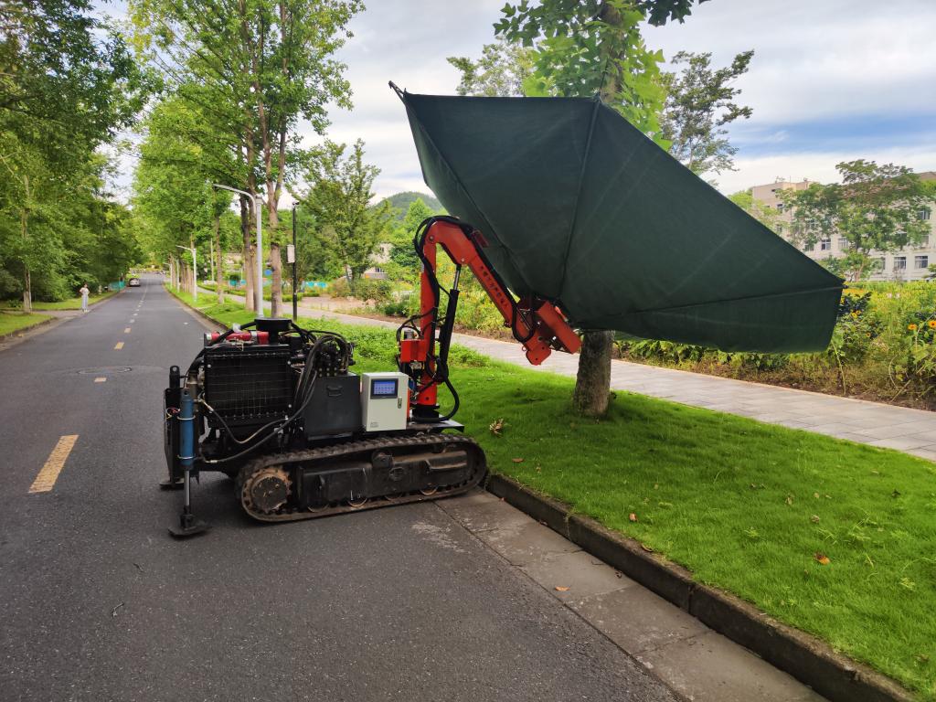钱孟波教授指导的学生团队由10多名学生组成,既有研究生也有本科生,既有机械专业学生也有林学等专业的学生,他们专业互补、协同研发。研发团队学生负责人、该校研一学生郑恒意介绍说,他们研发的机器人是一款以六连杆折展单元构成的倒伞型折展机构作为果实收集装置,不需要人在设备上操作,通过相关的的程序进行控制。其独特的结构赋予其较大的折展比,并通过伸缩杆的调节,实现收集范围的灵活调整,从而提高了机械的普适性,使其能够适用于十多种不同类型的林果采收。