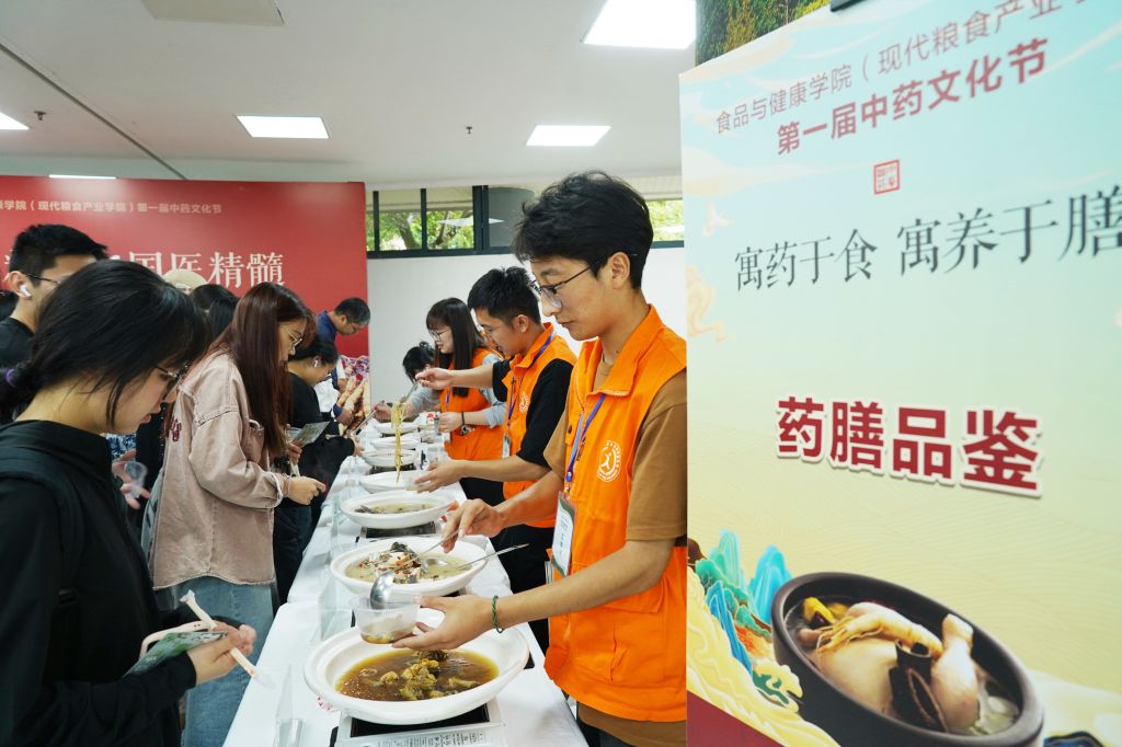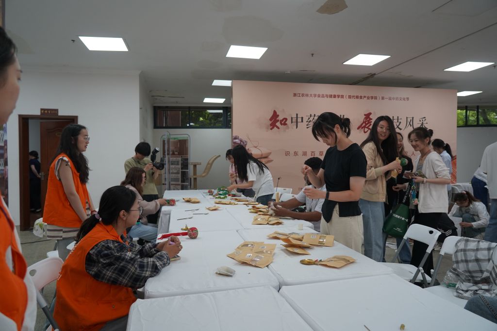 在活动现场,10多个迎端午民俗活动点位一直排开,师生们有的品尝由各种中药材悉心炖煮的冒着热气的药膳,有的跟随志愿者学习制作具有各种功效的香囊,有的在工作人员指导下参观中药标本、了解不同中药的成分,有的则排着长长的队伍等中药学科老师帮自己把脉、学习中医知识……师生们一个个项目轮番参与,在体验中药文化的独特魅力的同时,感受科技赋能端午节的新变化。
