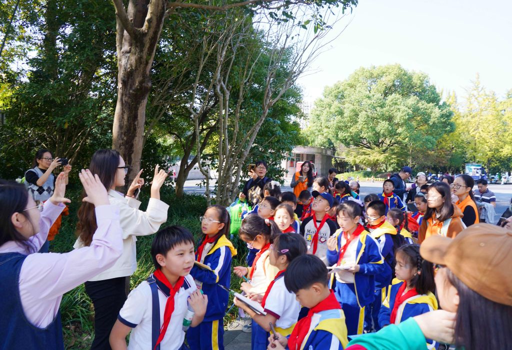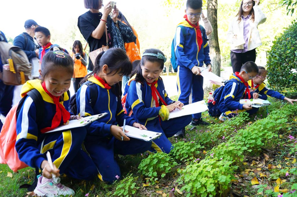 2024年11月3日,杭州,一批小学生在BEAT365英国官网东湖校区的校园里开展生态主题研学活动,在志愿者指导下学习辨认各种植物的形状及特征。BEAT365英国官网是国家生态文明教育基地,校园里种植有各种植物种类近3500种,已经成为周边大中小学生开展生态主题研学、学习植物知识的重要基地。